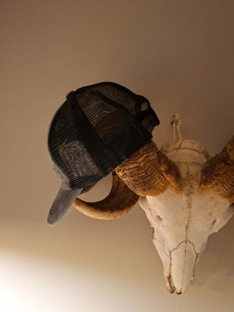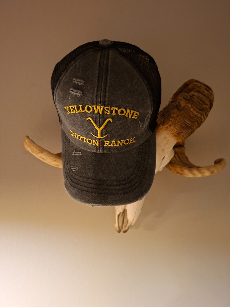 Zwarte pet met gele opdruk en de achterkant is gaas.