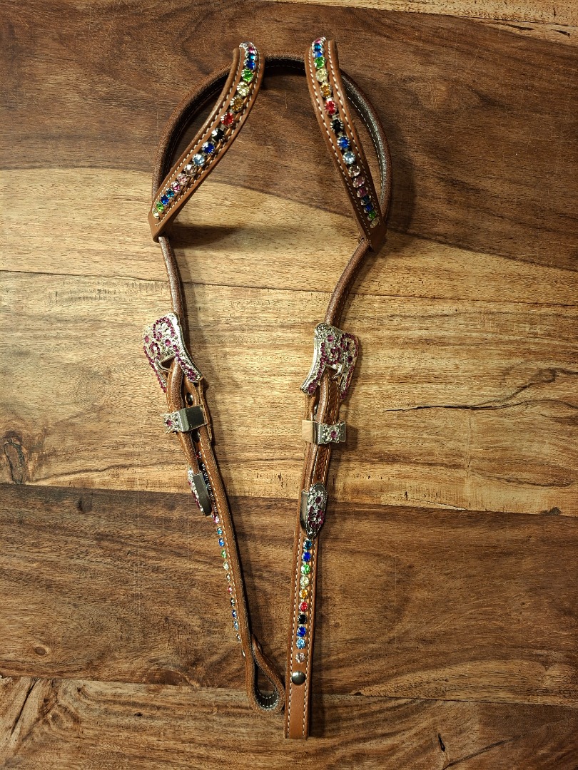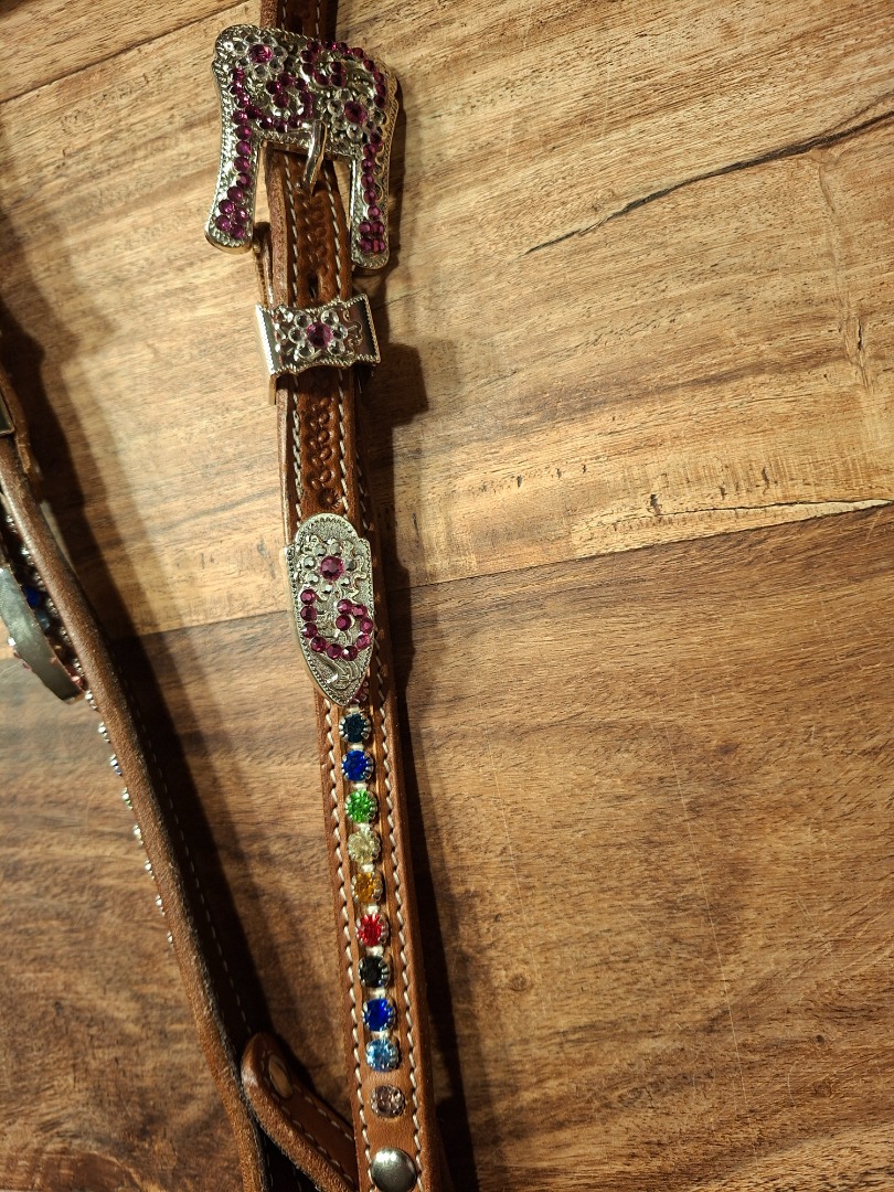 Met deze 2 ear met multicolor rhinestones op de oortjes en de cheekpieces en silver concho's en buckles voorzien van amethist en crystal rhinestones steel je de show.