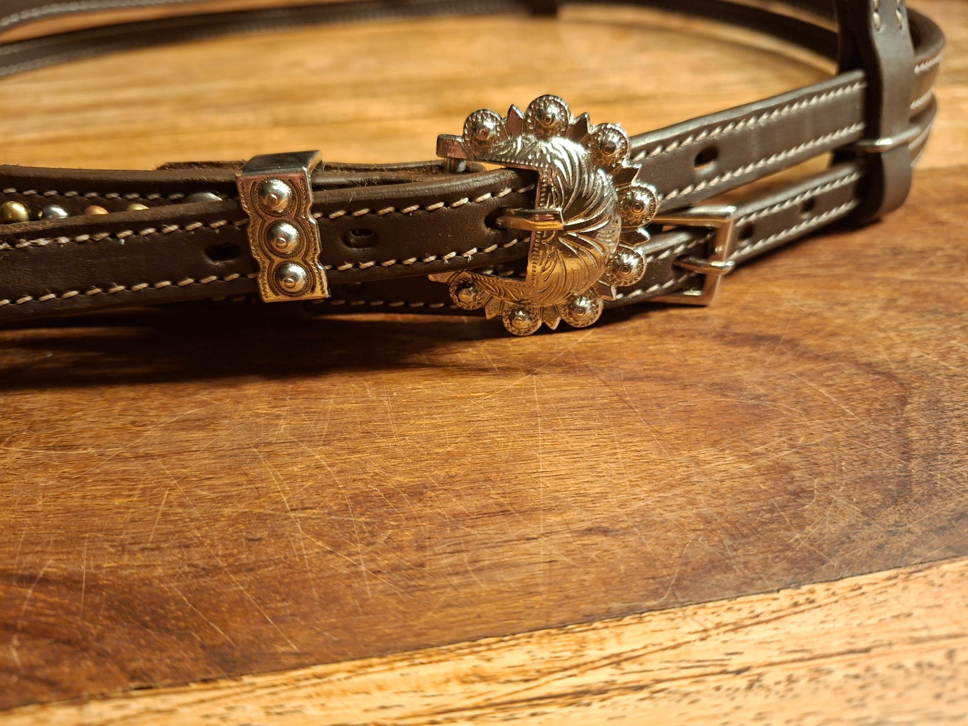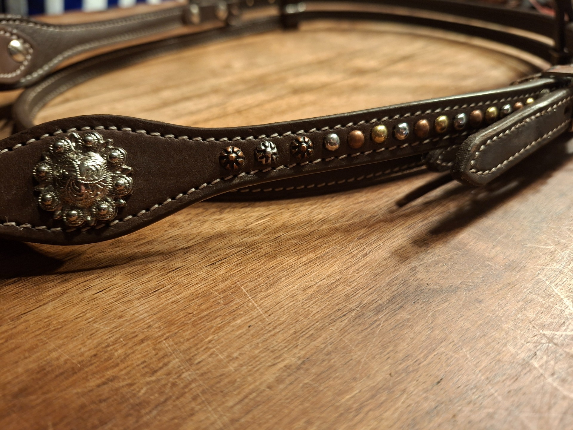 Met een futurity browband en in de kleur brown heb je op de browband en de cheekpieces 3 verschillende kleuren en 2 verschillende soorten dots.